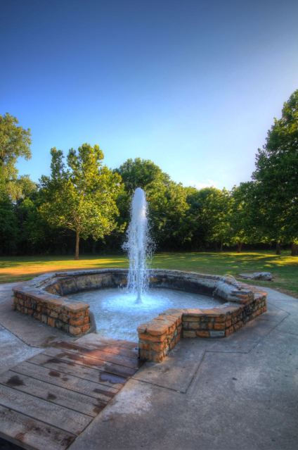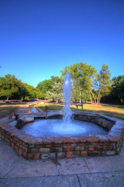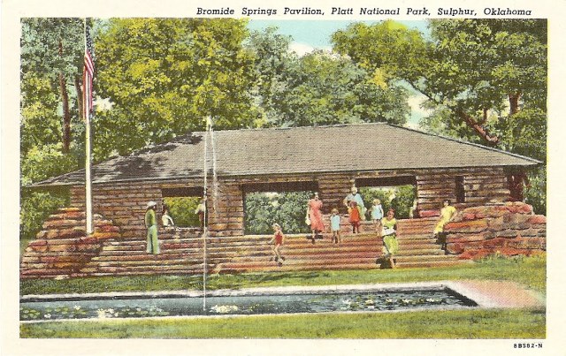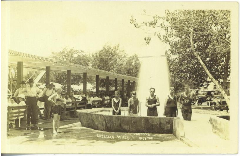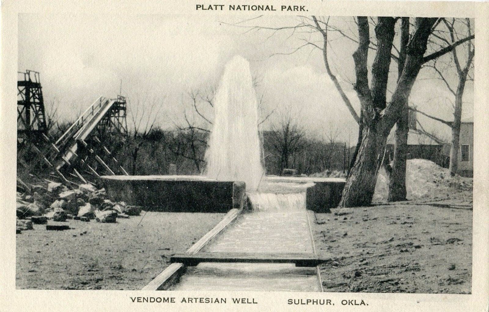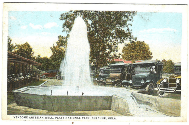 Fortunately, the well is still there as part of the Chickasaw National Recreational Area (formerly the Platt National Park). There’s a slight scent of sulphur when you approach the well; nothing offensive, but you know it’s there. I sipped from a squirting water fountain at the well site; just a hint of salinity (the water is probably just north of fresh at 1,000 ppm of total dissolved solids [postnote: I have a good tongue! After originally writing this in 2016 I read today that total dissolved solids in this well was about 1,200 ppm]). The Vendome well was drilled in 1922 to a depth of 325 feet. The well casing is 6 inches in diameter (the pipe through which the water flows is of a smaller diameter to generate more drama for the flow, something commonly done with flowing artesian wells back in the day. The water gushes from the Arbuckle and Simpson aquifers