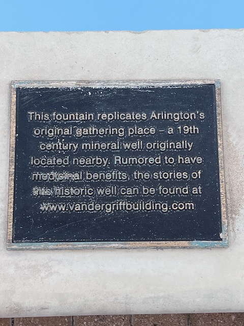 So when I roll into town planning to gawk at the site of a long-gone artesian well, I don’t expect to find much. In the case of the well above, as reflected in a postcard from my collection, I only hoped to find the intersection where the well used to be, take a few wistful photos, and ponder the past. So I was pleasantly surprised to find that Arlington’s well has left quite a mark on downtown as it goes through renewal.