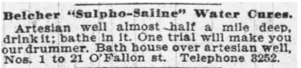 William Belcher, in his search for better quality water for his sugar refinery in St. Louis, commissioned a deep well in search of artesian water (American Journal of Science 1853). His crew began drilling a borehole in the spring of 1849 at Second and O’Fallon streets using hand power. After 18 months of drilling, the borehole had only reached a depth of 219 feet, after which Mr. Belcher commissioned the use of a steam powered drilling apparatus. With this new technology, his drilling team reached a depth of 2,199 feet by March 1854 (Litton 1860) at which point the well produced highly mineralized water at 75 gallons per minute (Shufeldt 1867 p. 20). The Belcher well struck gas and brackish water but ultimately didn’t tap a fresh flowing water source. Even though Belcher plumbed most of the salty “sulphuretted” flow to the city sewer, the well’s water found its fans for its medicinal and remedial virtues (Litton 1860, Bullard 2004). The water was later used for the Belcher Water Bath Company, whose bathhouse operated until the 1970s (Bullard 2004).