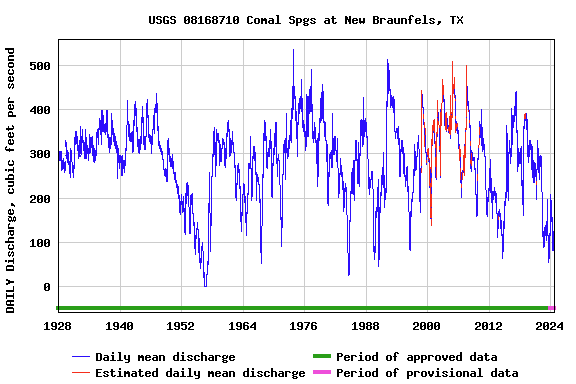 Something I noticed a couple months ago with the Comal Springs hydrograph above is (1) how the record started in late 1927 and (2) the relative stability of springflows before 1950 as compared to springflows during and after the 1950s when groundwater production ballooned. This suggests that the amplitude of springflow variations increased two to four times due to pumping.