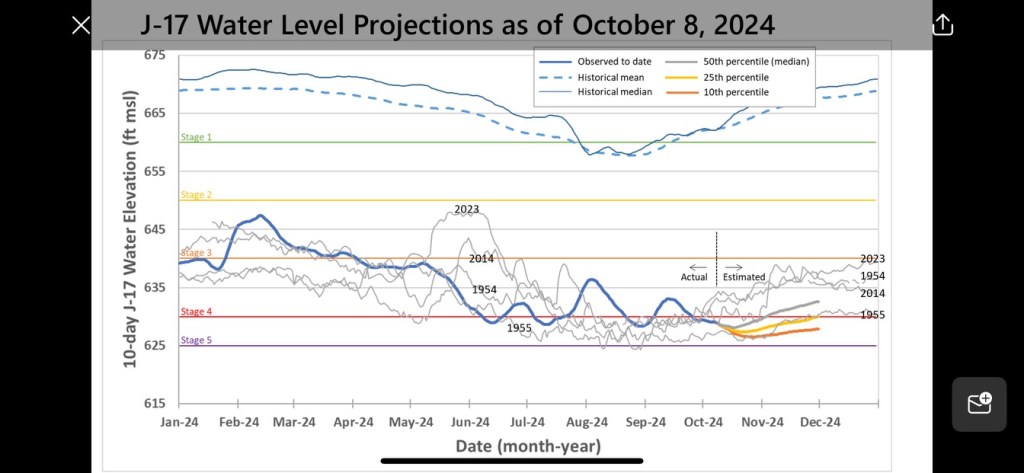 Statistical three-month projections shows what might happen at the 10th, 25th, and 50th (median) percentiles. With a La Nina favored for the fall, drier conditions are expected, so the 10th and 25th percentiles are more likely, suggesting Stage 4 drought conditions through at least the end of the year. Perhaps the anticipated weak La Nina will allow a few showers to get through. We certainly need ’em.