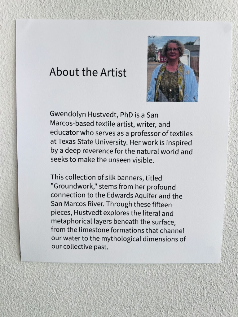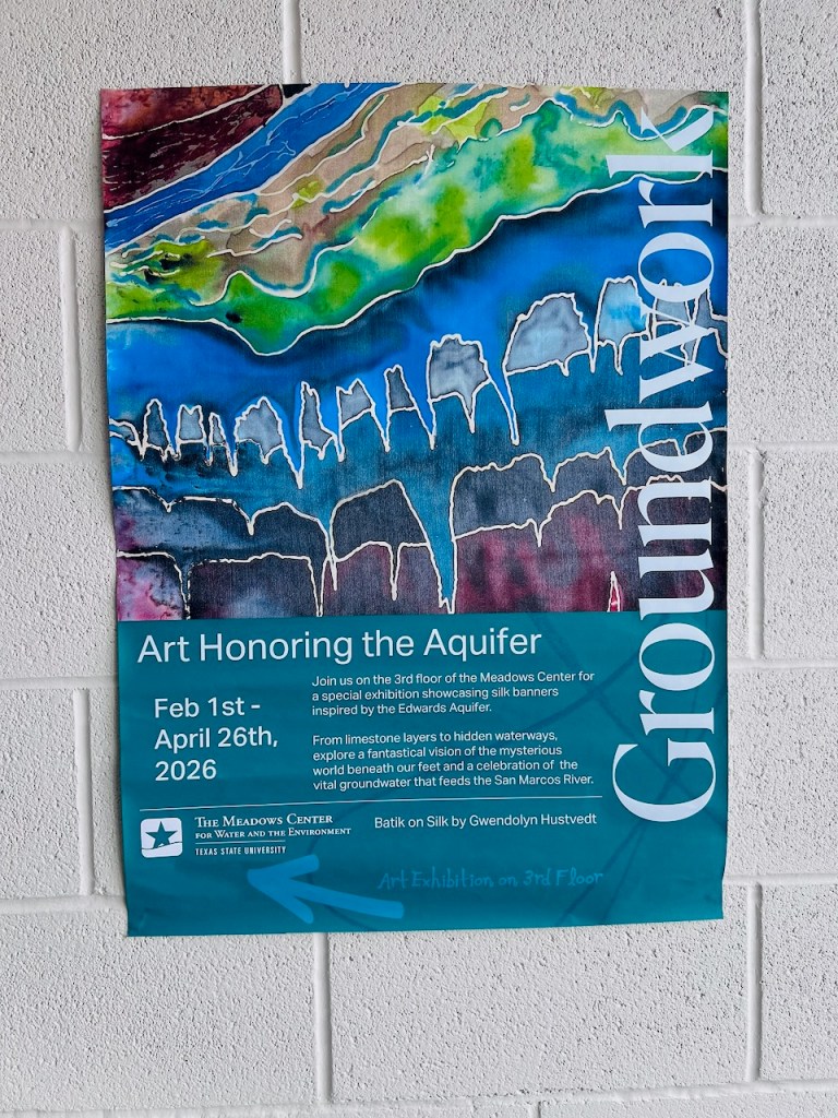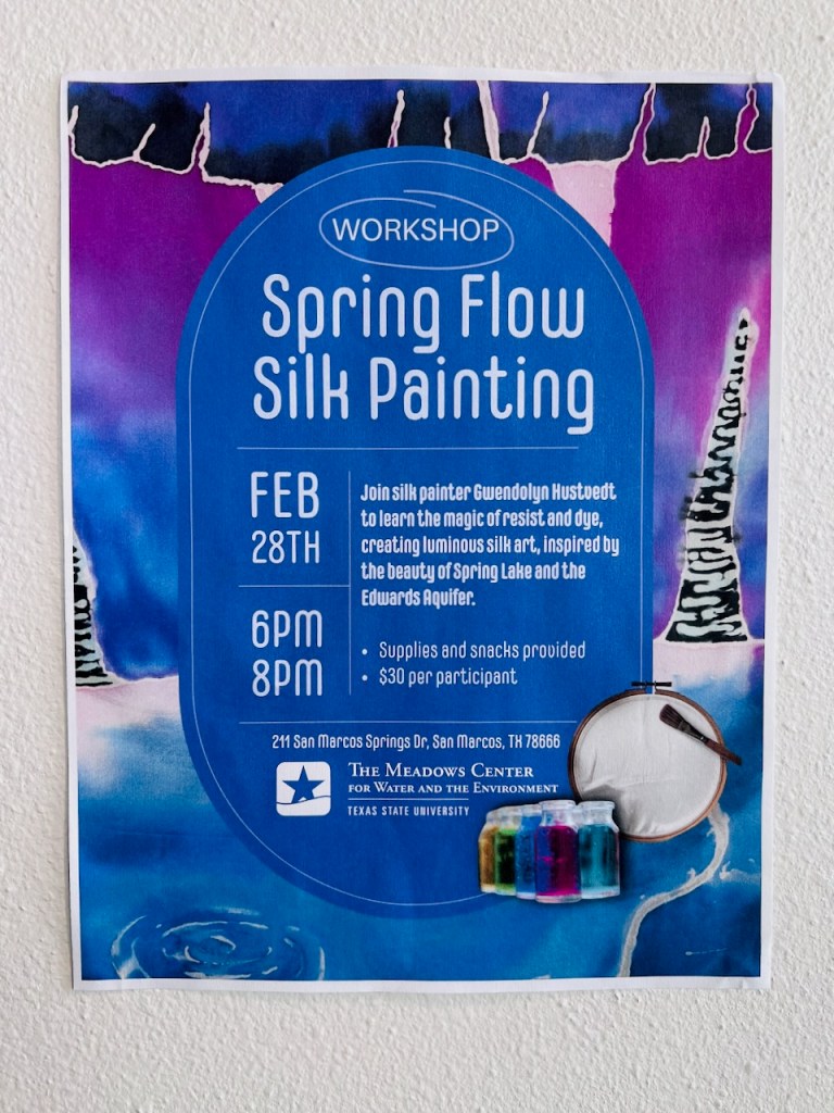 Last year, I participated in a university town hall on water and was on a panel with someone from the Biology Department, Engineering, and Gwendolyn from Fashion Merchandising. “Fashion Merchandising?” you ask. Yes! Gwendolyn makes silk prints inspired by the Edwards Aquifer and other environmental settings!